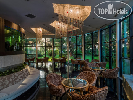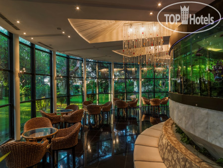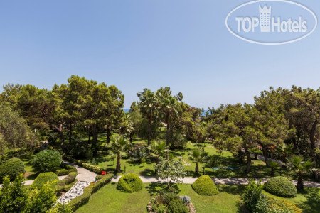 Территория очень зелёная, много всего интересного: бананы, мандарины, пальмы цветы. Море просто шикарное: зайти можно как с берега (галька, но и камни большие), так и с пирса. Есть несколько входов в море. Также не пирсе расположены павильоны с диванчиками, но они платные. Если брать для компании, то вполне удобно. На них два типа формирования цены: с обслуживанием (приносят напитки, мороженое и тп) и без.